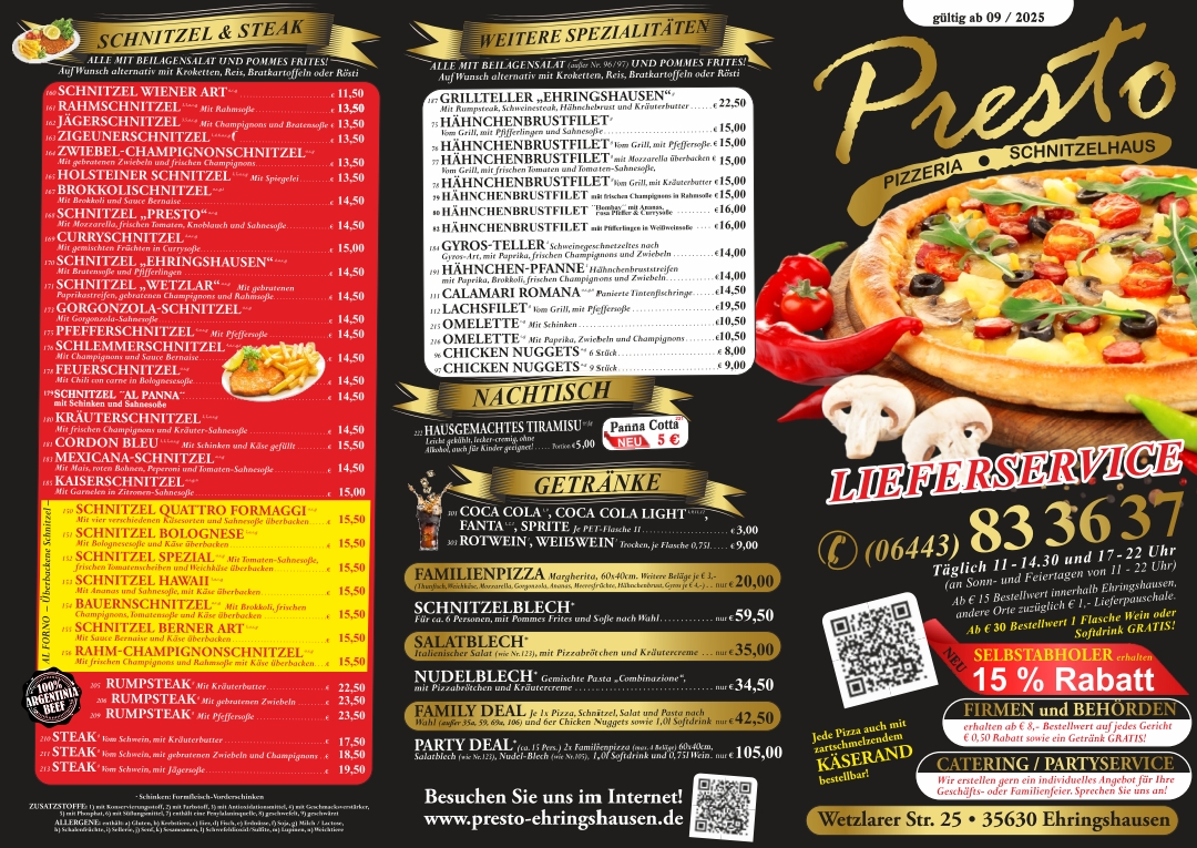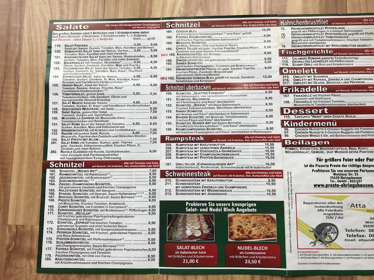 Pizzeria Presto in Ehringshausen offers a menu that effortlessly balances classic comfort foods with fresh, vibrant flavors. The Diabolo stands out for its perfectly baked crust and rich, spicy toppings that deliver a satisfying kick without overwhelming the palate. Meat lovers will appreciate the hearty Cordonbleu Und Schnitzel, each piece tender and golden, served with sides that complement rather than compete with the main dish. For a lighter option, the Italienischer Salat is a crisp, colorful mix of fresh vegetables, dressed just right to enhance the natural flavors. Overall, the menu reflects a thoughtful selection that caters to diverse tastes, from indulgent, savory plates to refreshing, lighter choices, all executed with consistent quality and attention to detail. The combination of well-prepared traditional dishes and appealing presentation makes dining here a reliably enjoyable experience.